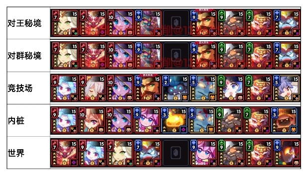 先把“对王秘境”及“对群秘境”两个板块做好,再去做“竞技场”及“世界组队”板块,“内桩”板块仅适合网页活动(不定期开)冲分点的时候再做
