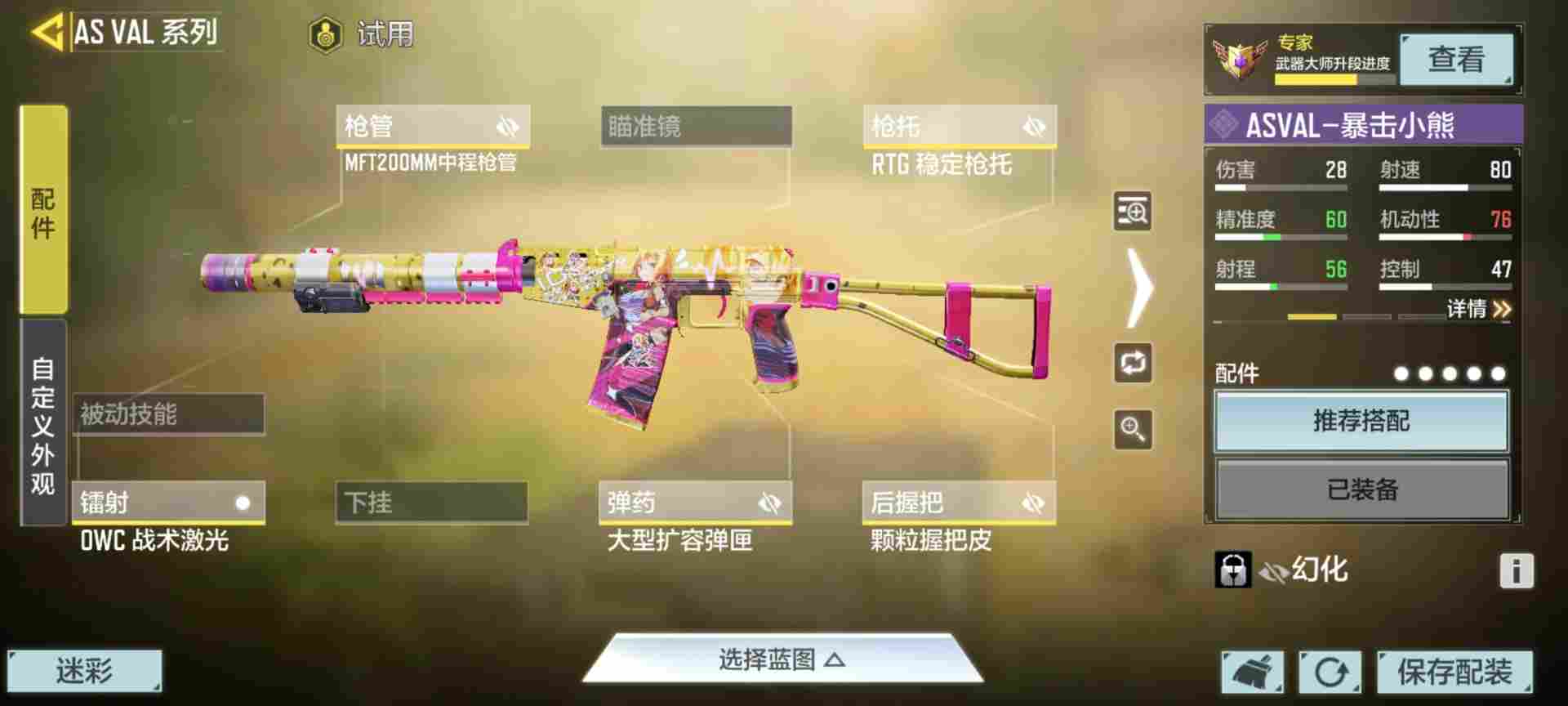 突击枪托,战术前握把A(架点可以换特战兵握把)和金属被甲弹能有效降低不利因素提高对枪胜率,配件的负面影响也较小