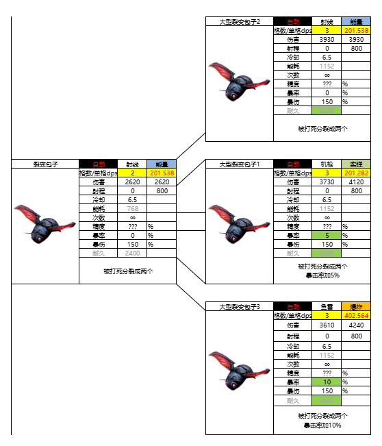 单格秒伤210。技能:被打死分裂成两个,二阶切换职业,可选能量射线0暴击率/实弹机枪5暴击率/爆炸鱼雷10暴击率